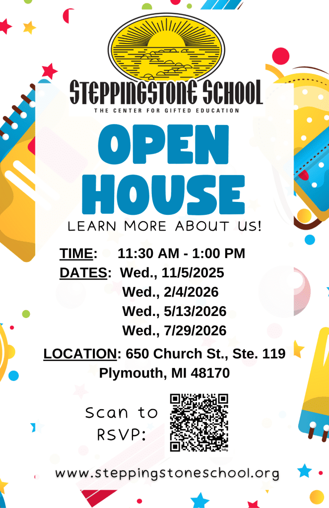 Join us at Steppingstone School for an Open House event to explore our unique educational program for gifted children. Meet our dedicated educators, tour our vibrant classrooms, and learn how we nurture intellectual growth, creativity, and compassion in our students.